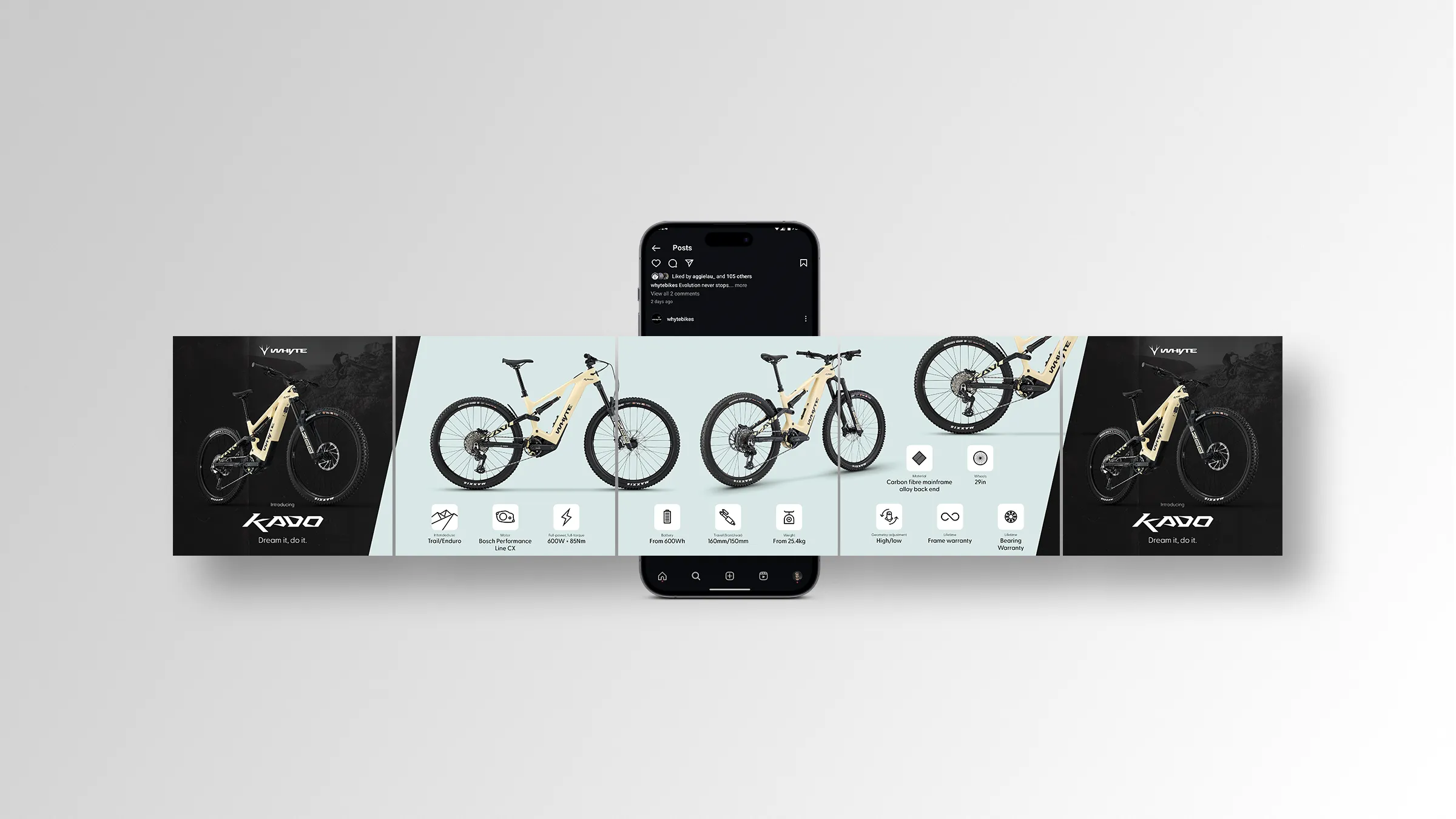 One of my many objectives when joining Whyte was to elevate the brand so that we were not only competing with industry leaders in performance but also in aesthetics—from the bikes themselves to the marketing. This ambition drove the development of EVO, a dynamic sub-brand for the ELyte bike range, positioning it as the pinnacle of innovation and performance. This involved crafting a compelling brand identity and executing a high-impact release campaign that effectively communicated EVO’s cutting-edge design and engineering advancements.