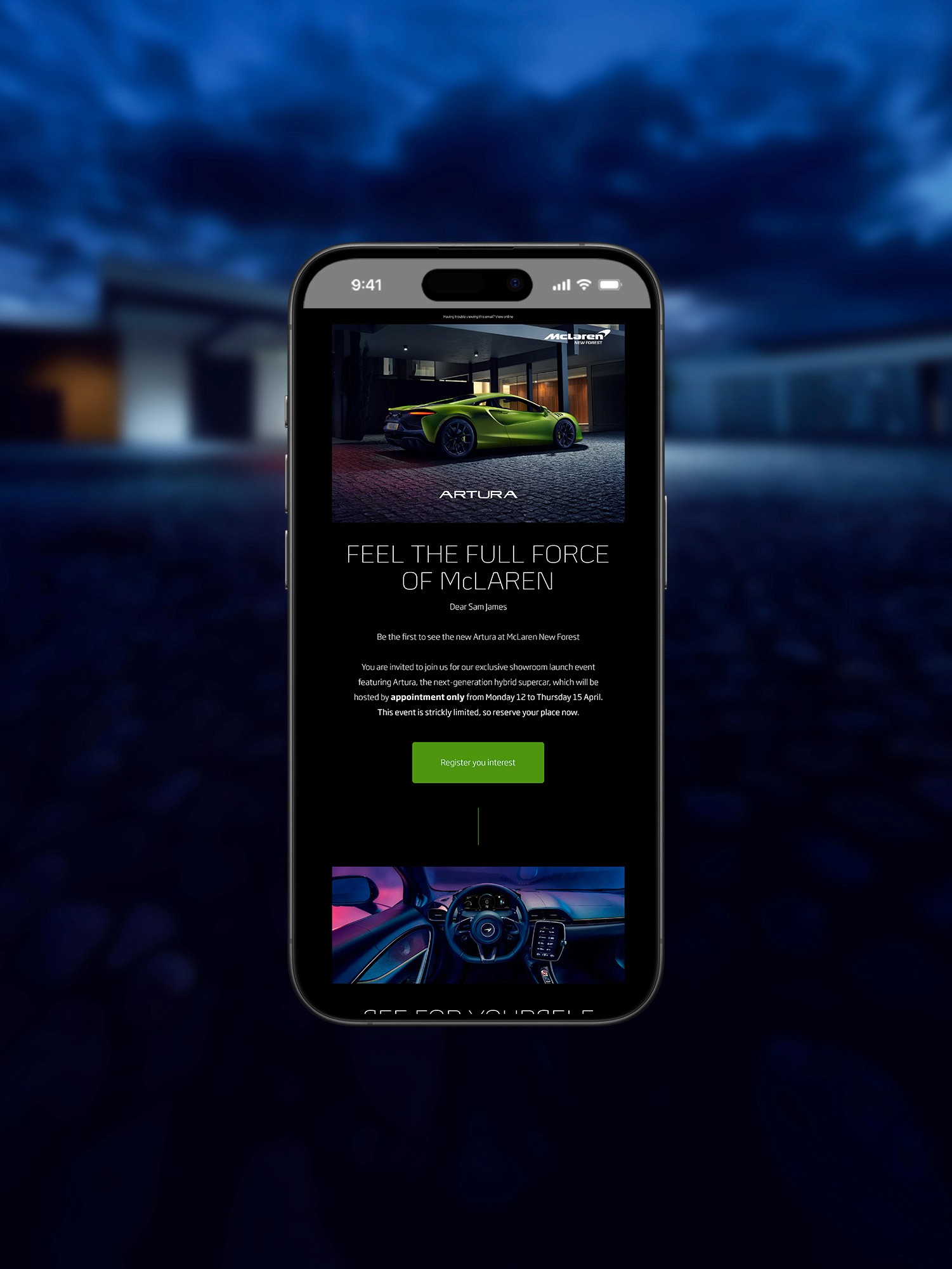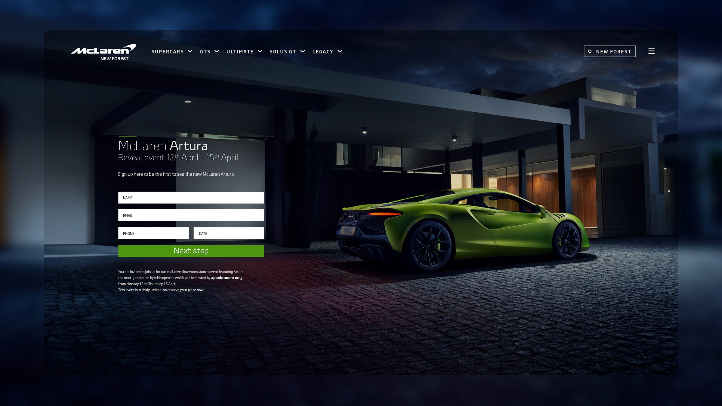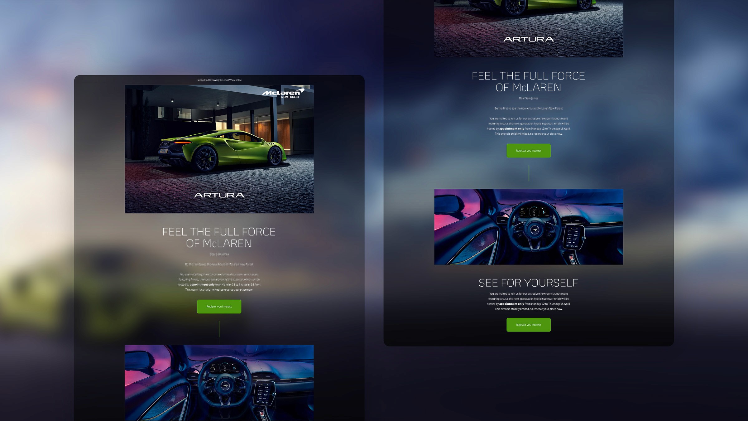 This included social media teaser content, designed to gradually reveal key design elements using dynamic visuals and motion graphics. Release materials, such as press kits and event collateral, ensured a cohesive brand presence. A dedicated landing page was optimised for high conversion rates, while a targeted email campaign used personalised messaging and premium visuals to drive sign-ups and engagement. The challenge was to create a campaign that not only maximised attendance but also reinforced McLaren’s prestige and innovation within the supercar market.